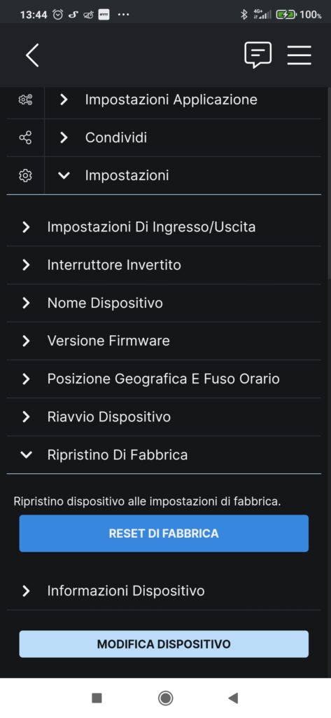 Nel caso sia necessario, potrete procedere al Factory Reset mediante l’app Shelly Cloud: andate alla voce Impostazioni – Ripristino Di Fabbrica per rimuoverlo dal vostro profilo e ripristinarlo alle impostazioni di fabbrica.