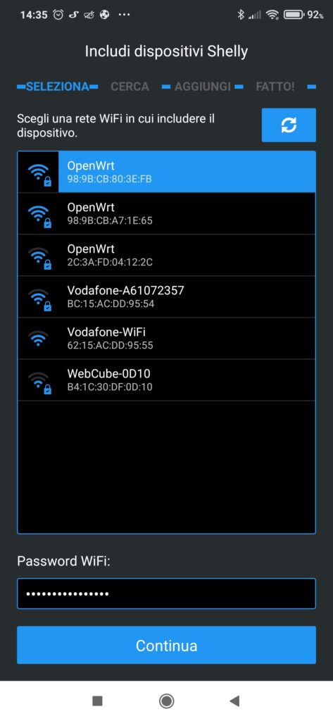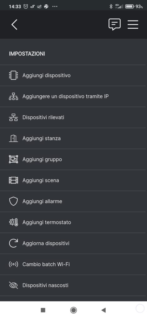Prima di procedere assicuratevi che il vostro smartphone sia collegato alla rete WiFi che intendete utilizzare per il dispositivo ed avviare la procedura mediante IMPOSTAZIONI – Aggiungi dispositivo, selezionando l’access point WiFi ed infine il dispositivo rilevato a cui dovrete dare un nome e potrete assegnare ad una stanza: