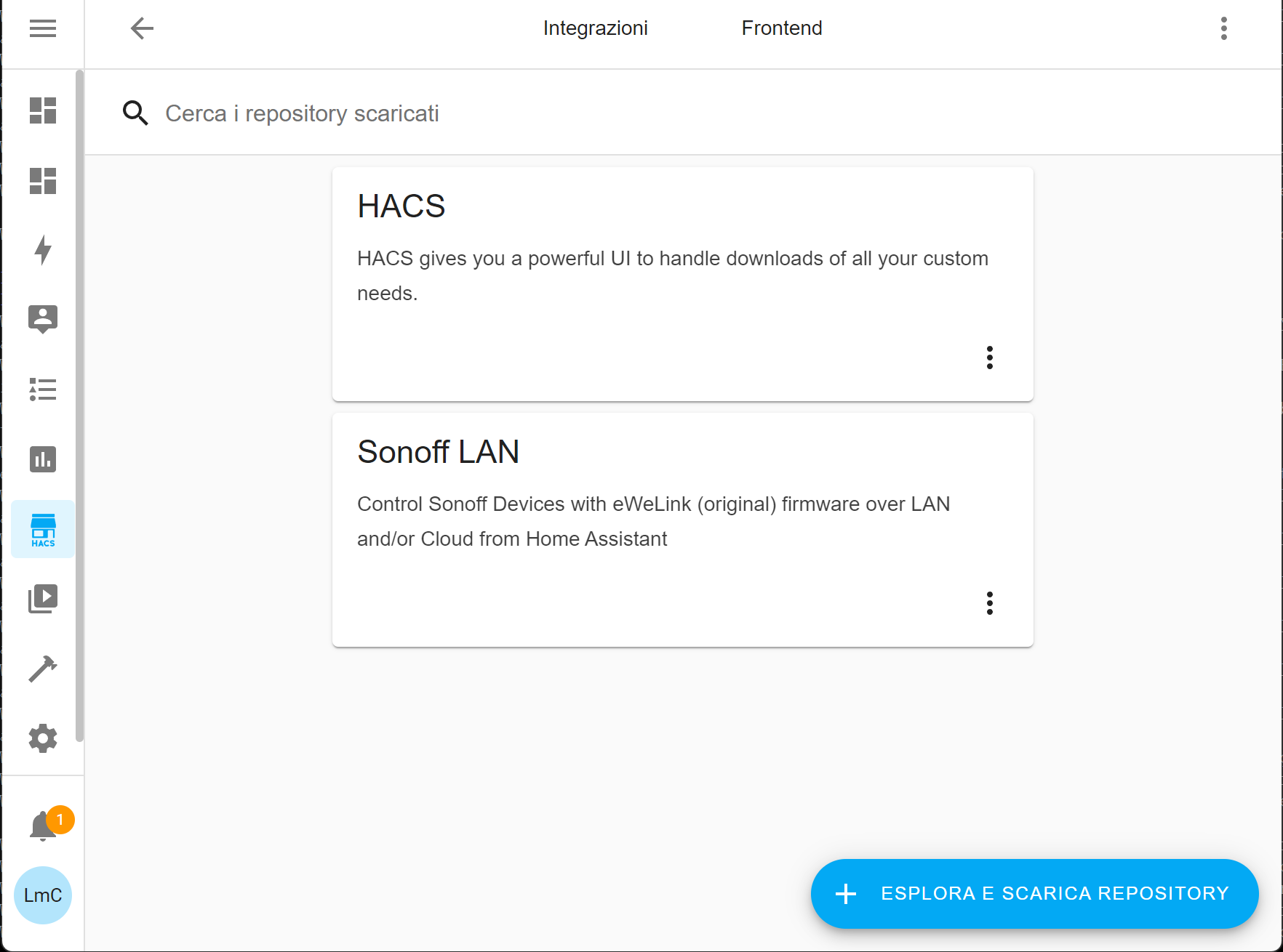 Per l’installazione di SonoffLAN, essendo un custom component di Home Assistant, la soluzione di gran lunga più semplice è utilizzare HACS.