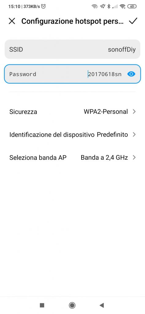 Verificate che il vostro smartphone sia collegato ad internet e create un hotspot WiFi a 2,4 GHz con nome rete sonoffDiy e password 20170618sn: